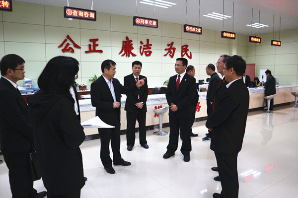 林副院长一行对钦南区法院诉讼服务中心升级后的情况进行了调研。去年以来,该院的诉讼服务中心在原有的基础上进行了升级,一是该院返聘退休法官2名,成立诉前调解小组。在诉讼服务中心开设专门窗口,专职开展诉前调解工作,让矛盾化解于萌芽,年内成功调解案件107件。二是增设律师法律援助室。由专职律师轮流值班,向群众提供法律服务,参与化解和代理涉法涉诉信访案件,帮助群众依法保障自己的合法权益。律师接待、提供法律援助92人次。三是认真落实立案繁简分流制度,成立民事速裁庭,整合审判力量,优化司法资源配置,提高审判质效。